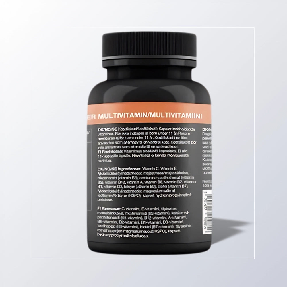 Hver kapsel indeholder et komplet spektrum af vitaminer – herunder C-, D-, E- og A-vitamin samt B6, B12, biotin og folat. Kombinationen støtter energiomsætning, restitution og immunforsvar. De høje niveauer af C- og E-vitamin beskytter cellerne mod oxidativ stress fra hård træning.